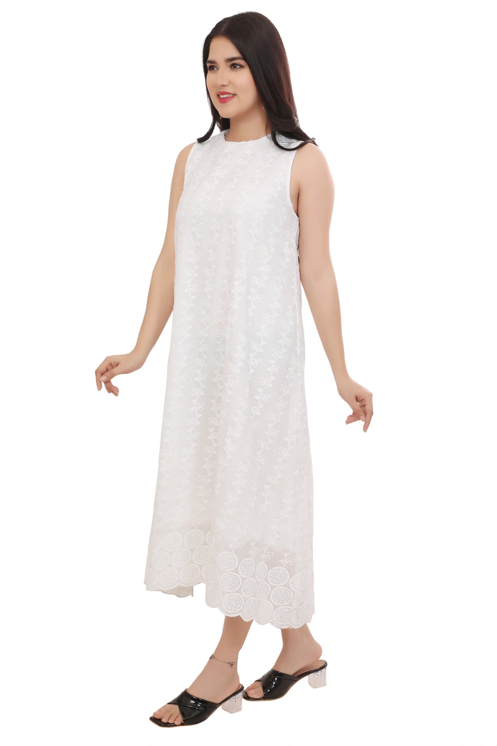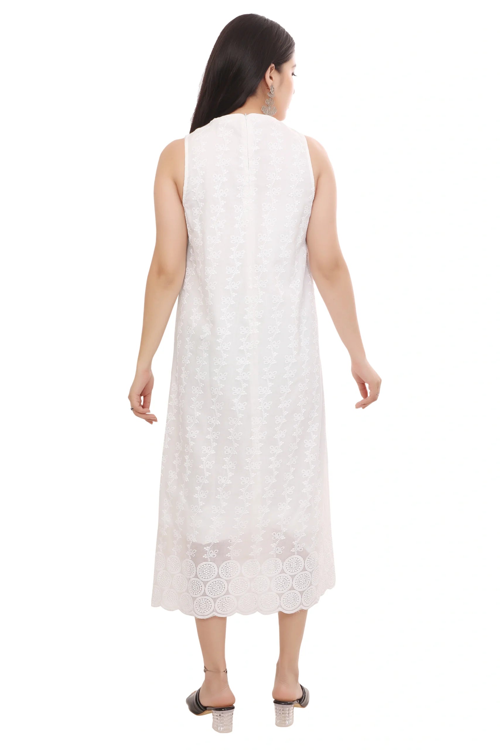 Effortlessly elegant, this sleeveless white A-line dress is crafted in soft, breathable embroidered fabric with delicate floral motifs all over. The neckline is minimal and clean, allowing the detailed scalloped hemline to take the spotlight. The flattering flare and midi length make it a dreamy pick for both day and evening looks.