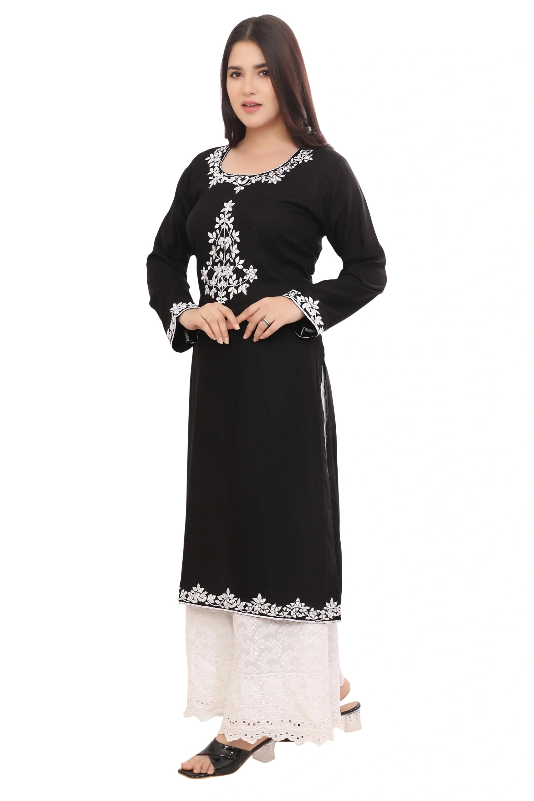 A timeless classic reimagined for the modern wardrobe, this black kurta with intricate white floral embroidery is a monochrome must-have. Crafted from soft, breathable fabric, it features delicate detailing along the neckline, hem, and cuffs, exuding effortless elegance. The side slits and straight cut make it a flattering choice for all body types. Paired here with scalloped white palazzos for a look that's graceful, grounded, and versatile.